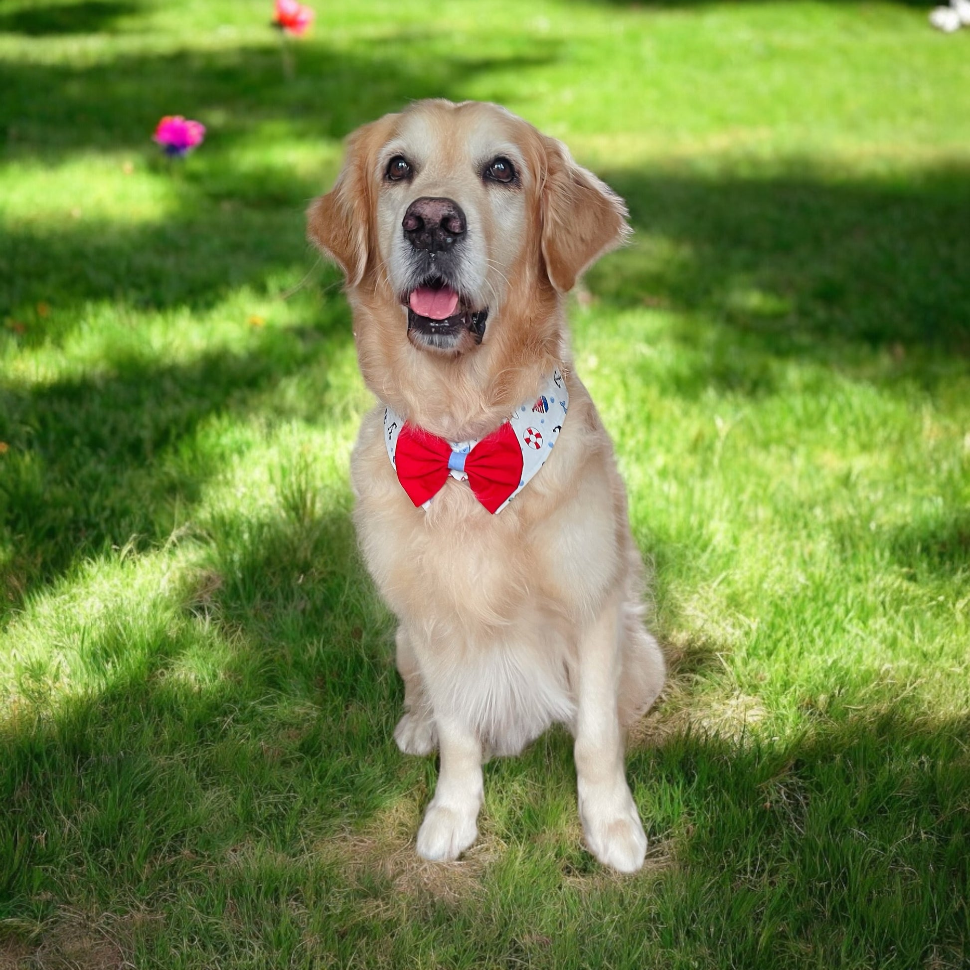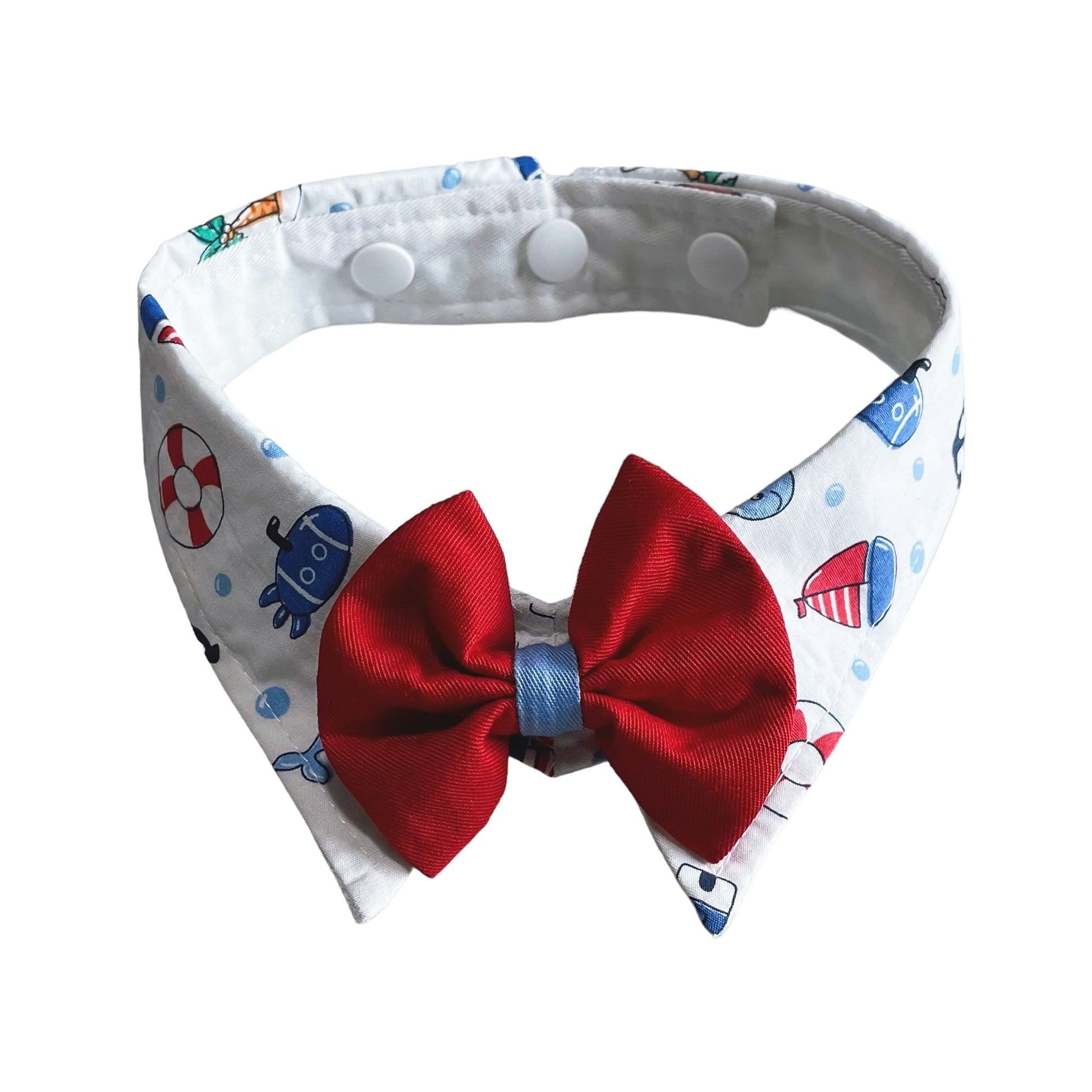 Button collar with whales and coconuts and all things beach print on white background. Outstanding red and blue colored bowtie. Wide adjustable sizes with 3 snap buttons